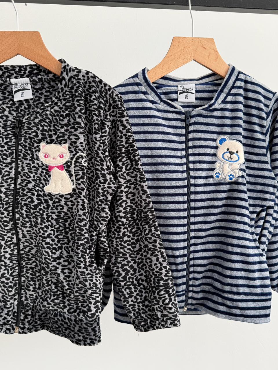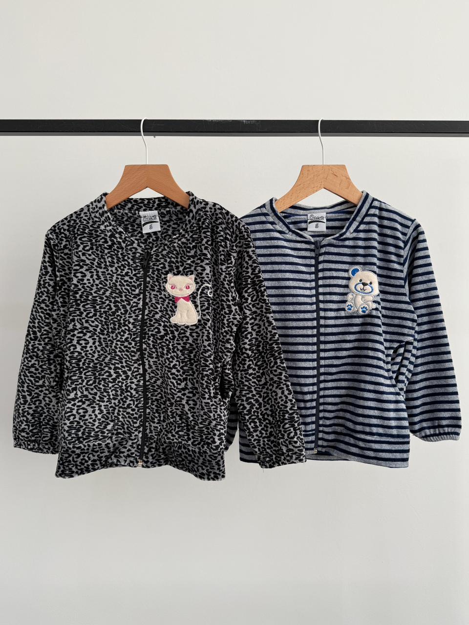 Modelo: Conjunto beba plush "GATO/OSITO"Tela: PlushTalles: 1, 2, 3, 4, 5Colores: Animal print (Gato blanco) - Animal print (Gato Negro) - Gris Claro (Rayas Azules)